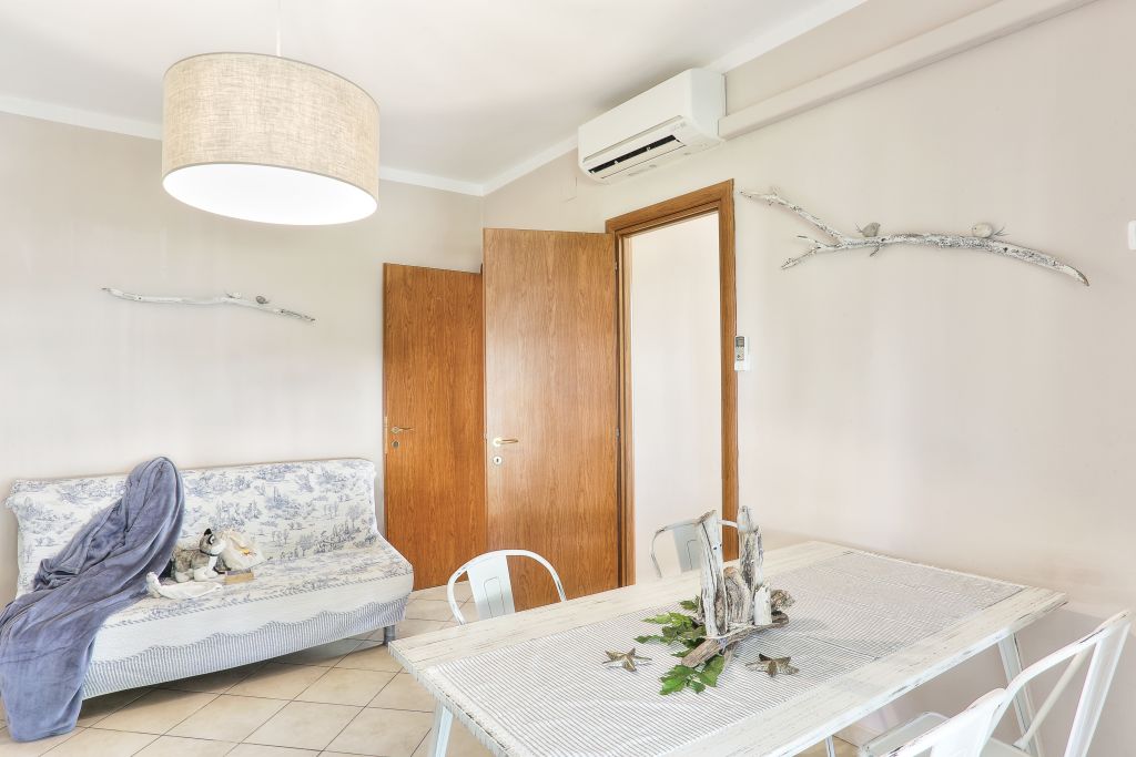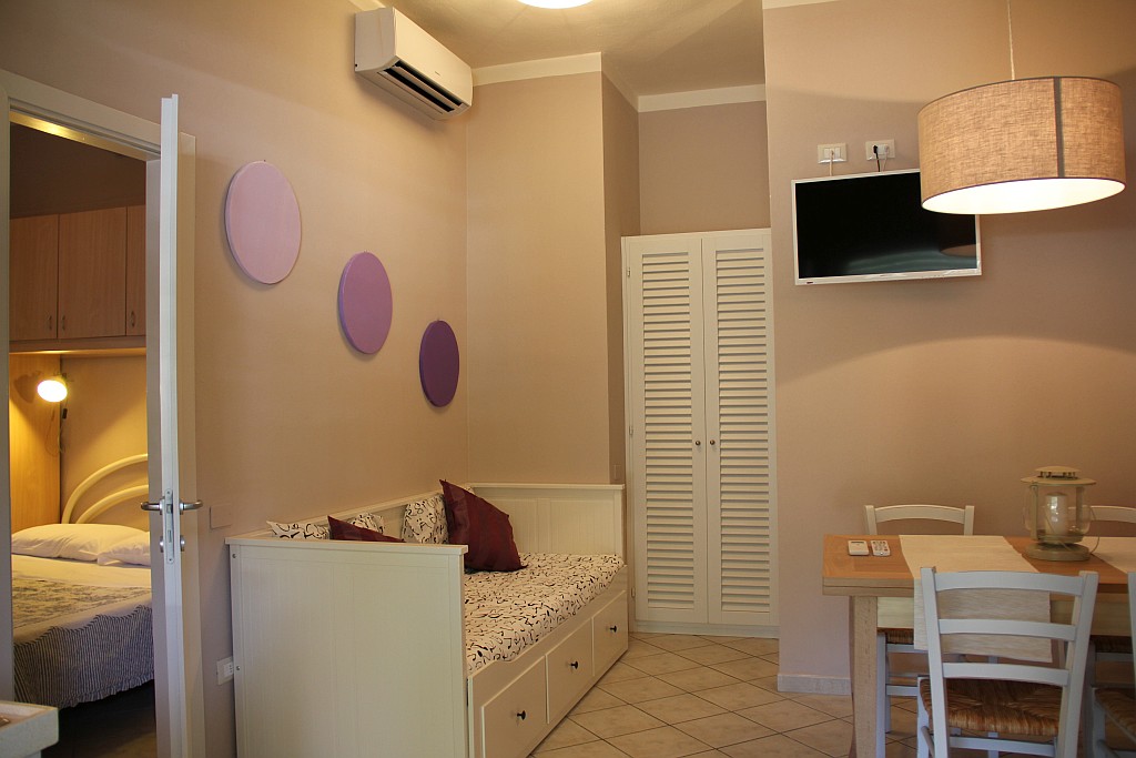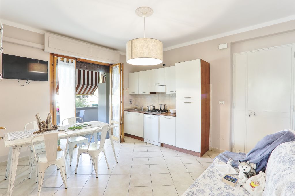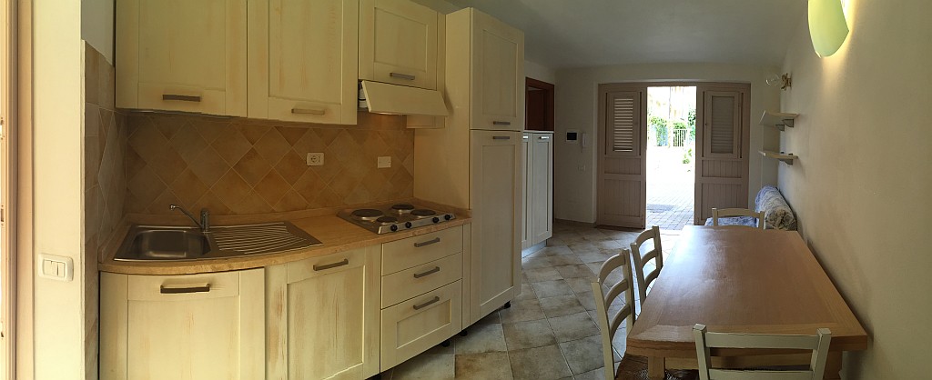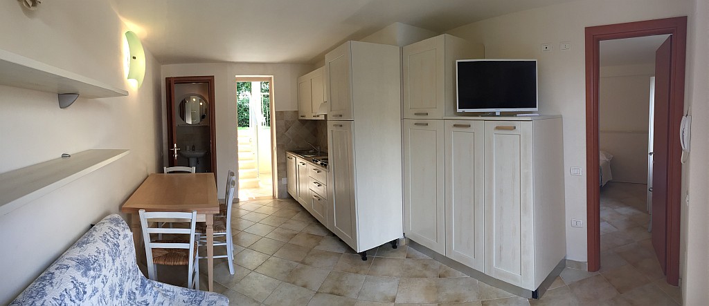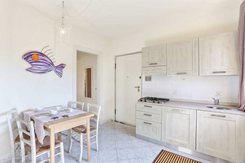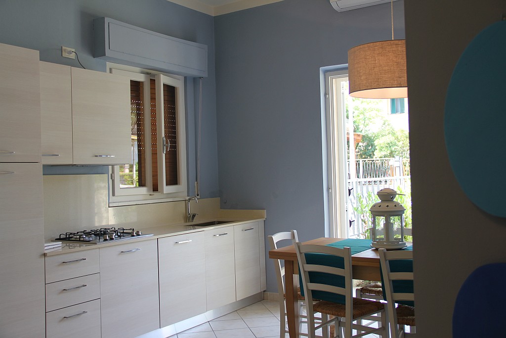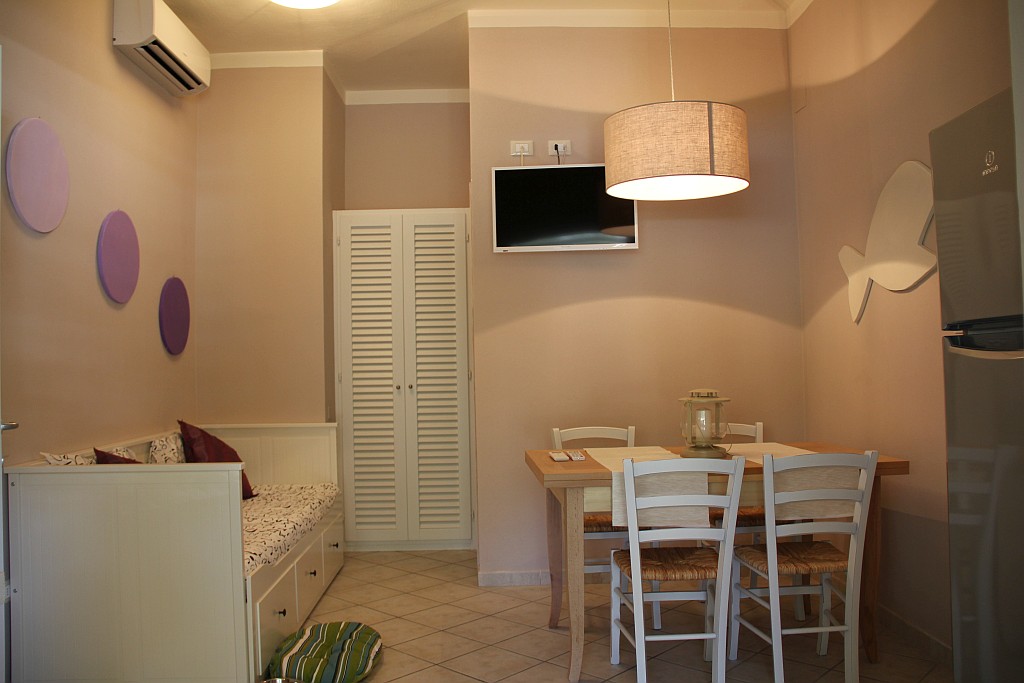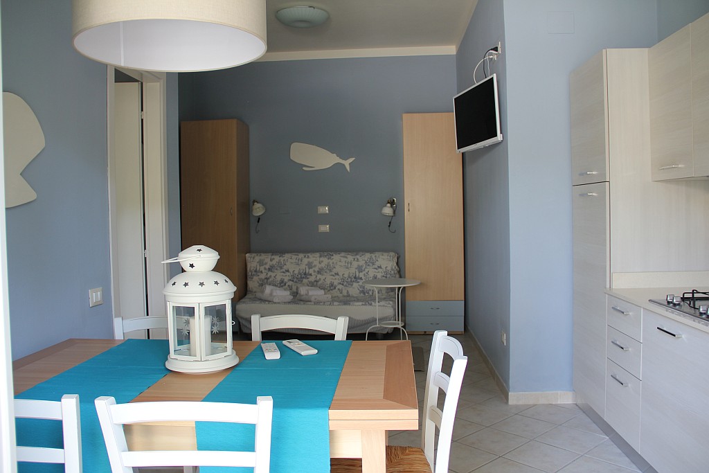 Bilocale composto da soggiorno con angolo cottura e divano letto matrimoniale, camera con letto matrimoniale e letto singolo. Doppi servizi. Situato al piano terra, soffitto alto 2,40 m. L'appartamento si trova al piano terra della Villetta Tina ed è a 450 m dal mare, attraversando 150 m di fresca pineta e a 300 m dall'Hotel Residence Stella del Mare.
