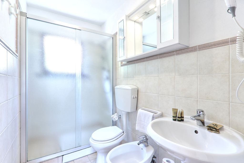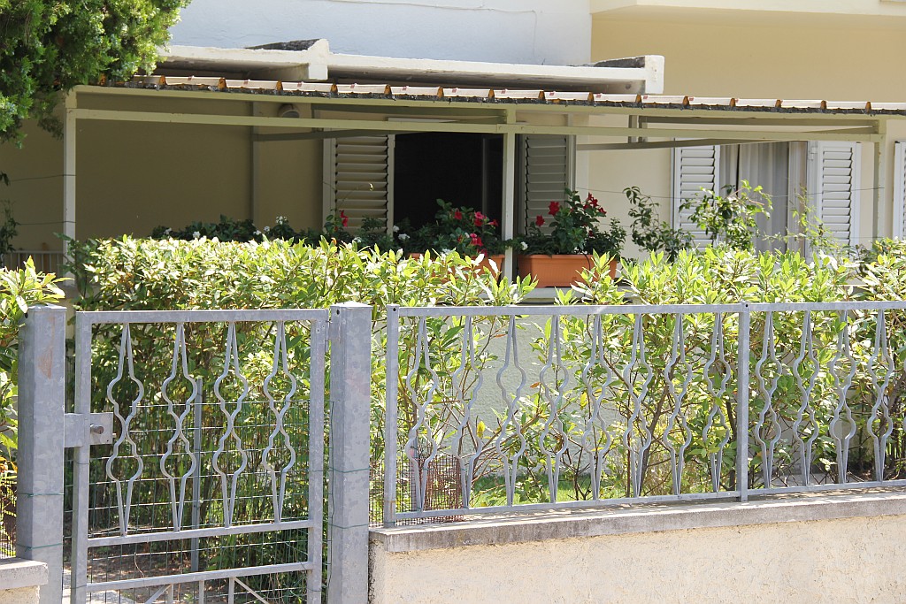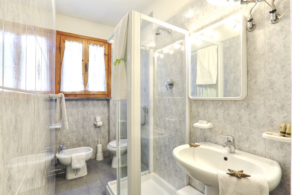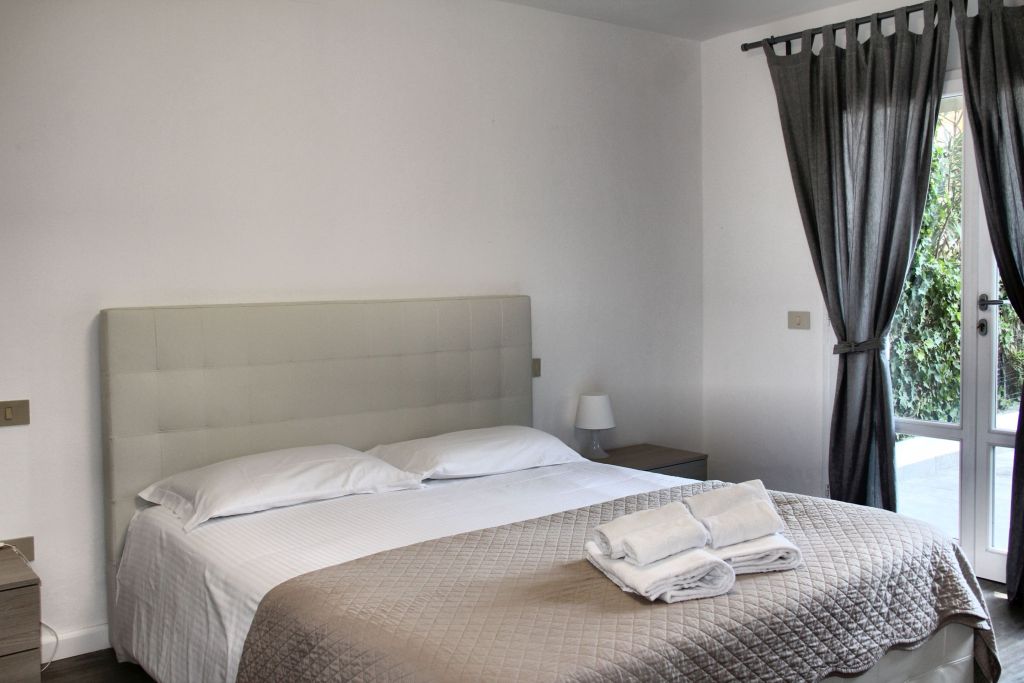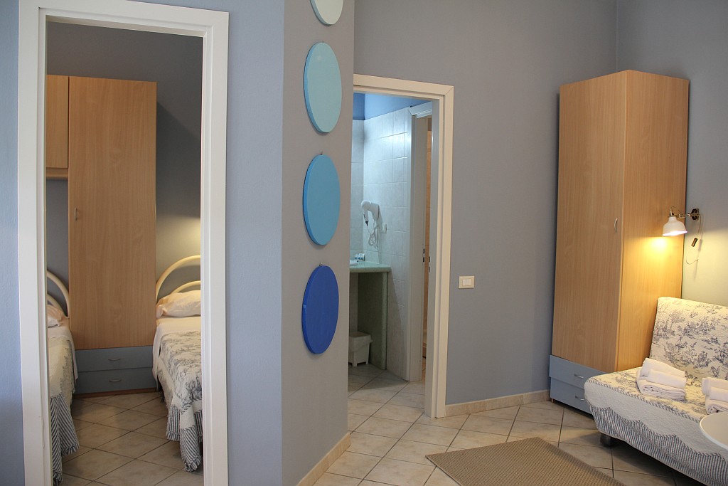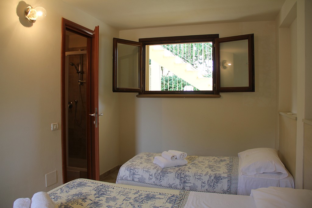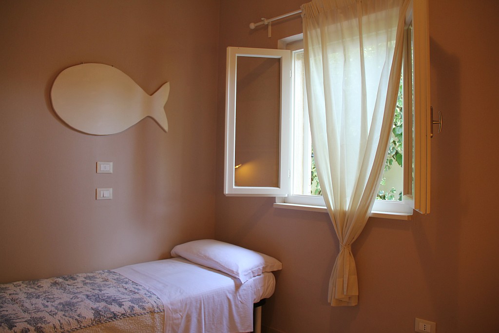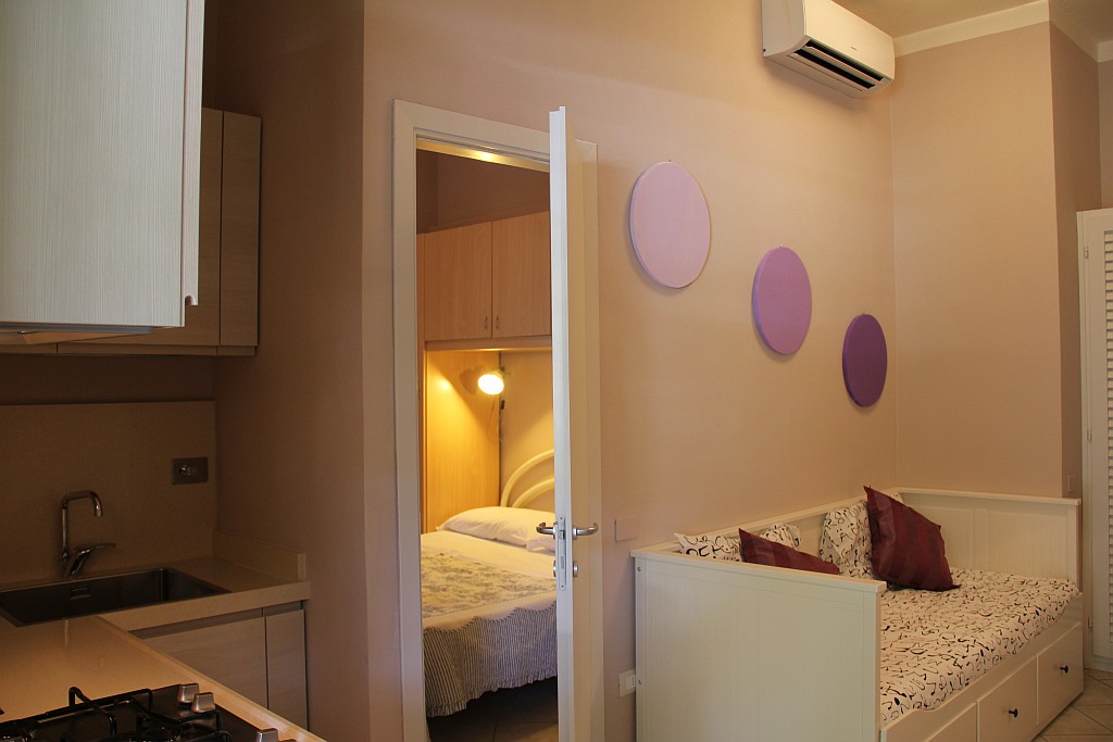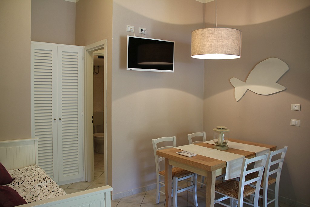 Bilocale composto da soggiorno con angolo cottura e divano letto matrimoniale, camera con letto matrimoniale e letto singolo. Doppi servizi. Situato al piano terra, soffitto alto 2,40 m. L'appartamento si trova al piano terra della Villetta Tina ed è a 450 m dal mare, attraversando 150 m di fresca pineta e a 300 m dall'Hotel Residence Stella del Mare.