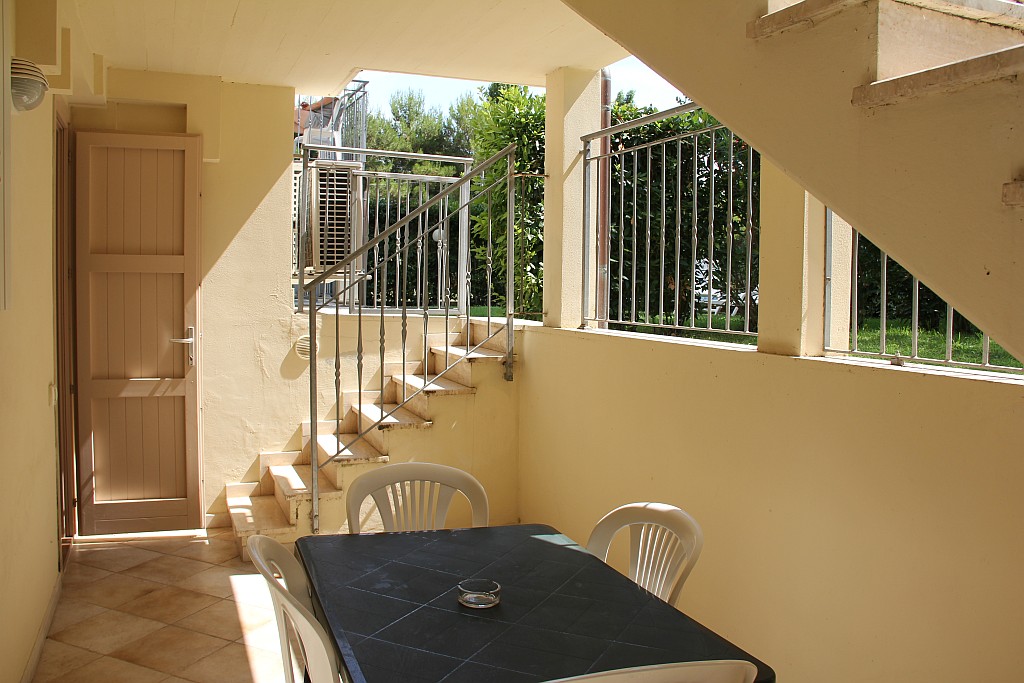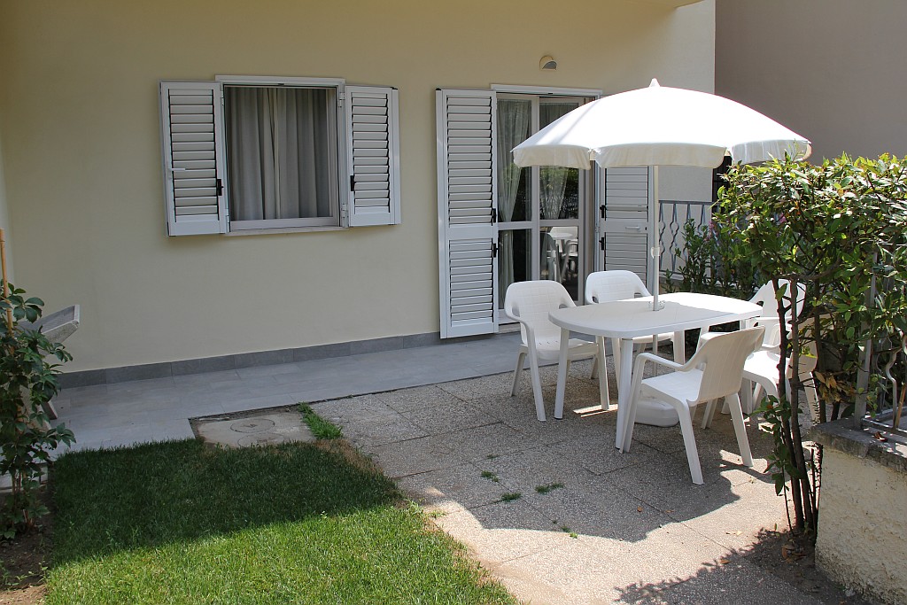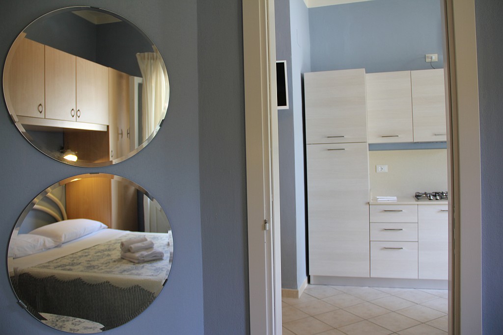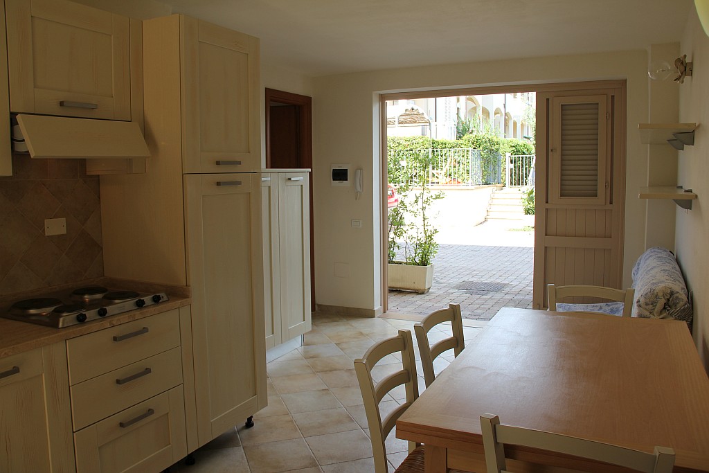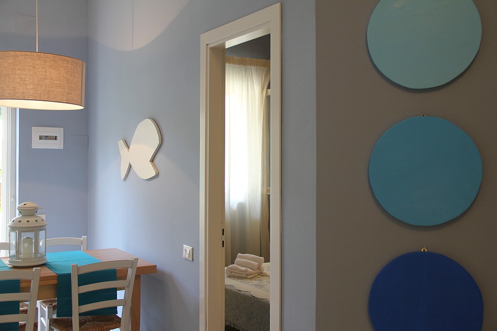 L'appartamento si trova al piano terra rialzato di un piccolo edificio a due piani ed è a 150 m dalla pineta, 300 m dal mare e 50 m da Hotel Residence Stella del Mare. Ha una superficie di 35 mq ed è composto da soggiorno con divano letto matrimoniale, angolo cottura attrezzato (fornello con fuochi a gas, scolapiatti, frigorifero, stoviglie da cucina, lavastoviglie), camera matrimoniale e bagno con lavabo, bidè, wc e doccia con box con un terrazzo di 8 mq.