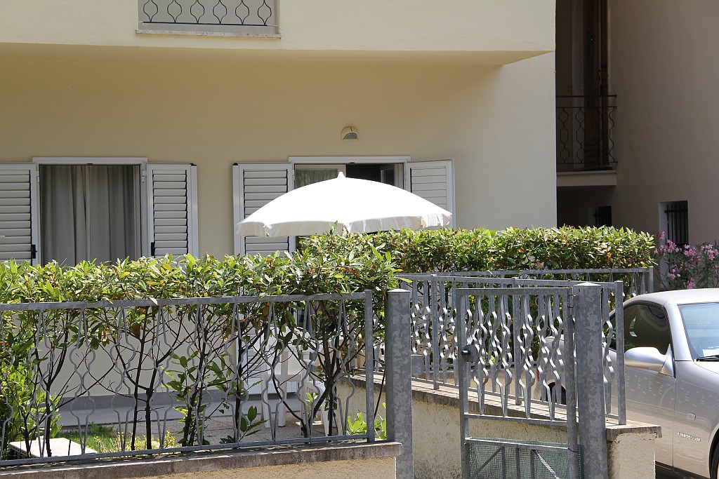 Completano l'appartamento una terrazza di 8 mq con veranda, tavolo, sedie e stendibiancheria, un giardino di 80 mq con barbecue, un parcheggio riservato. Questo alloggio è dotato di cuscini, copriletto, coperte di lana, televisore e cassaforte.