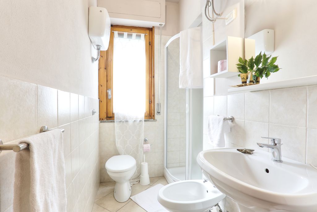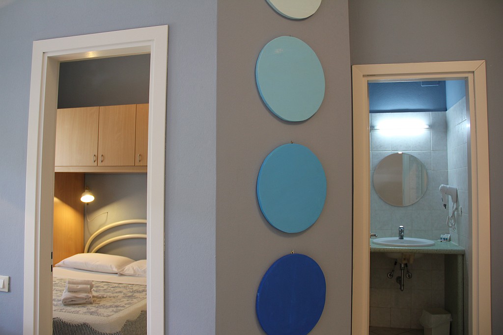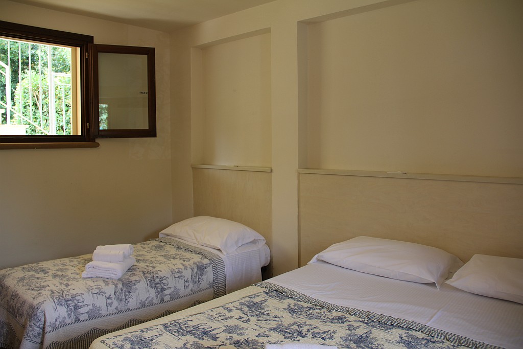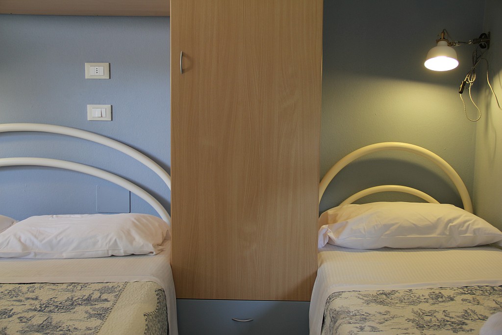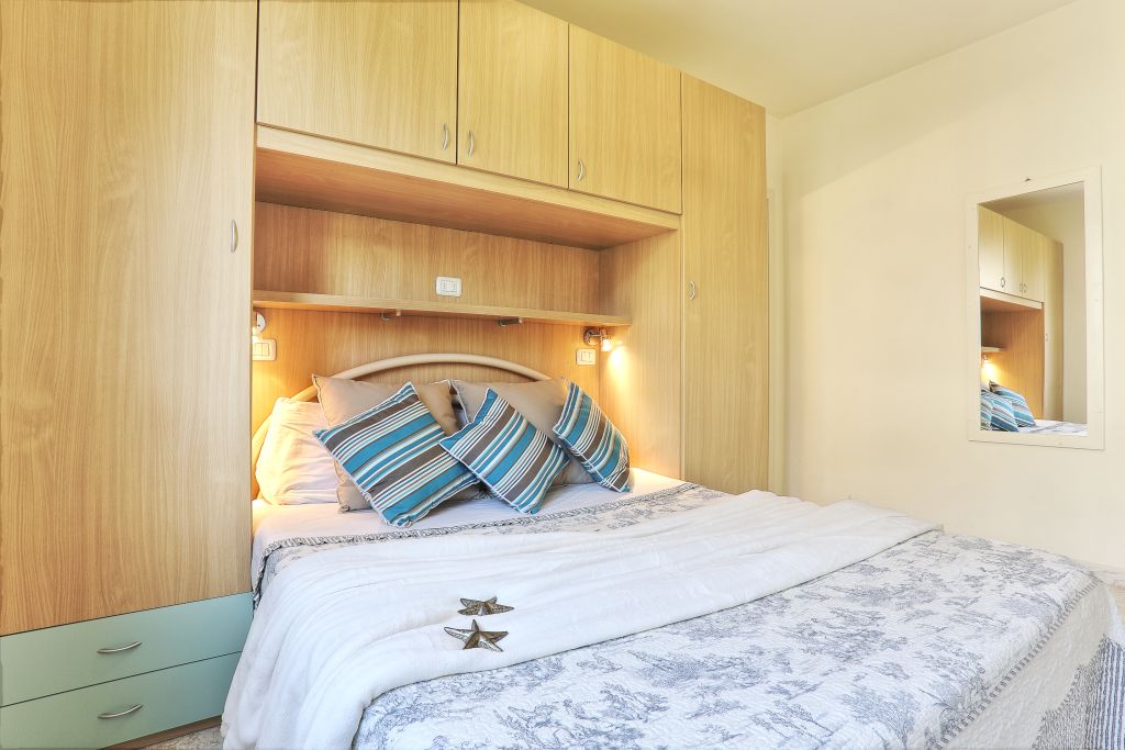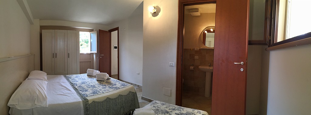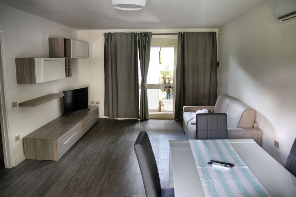 Il primo dei due bilocali si sviluppa su una superficie di 35 mq e comprende un soggiorno con angolo cottura (fornello con fuochi a gas, cappa aspirante, scolapiatti, frigorifero, stoviglie da cucina) e divano letto singolo, una camera matrimoniale con un letto singolo, un bagno dotato di lavabo, bidè, wc e doccia con box.